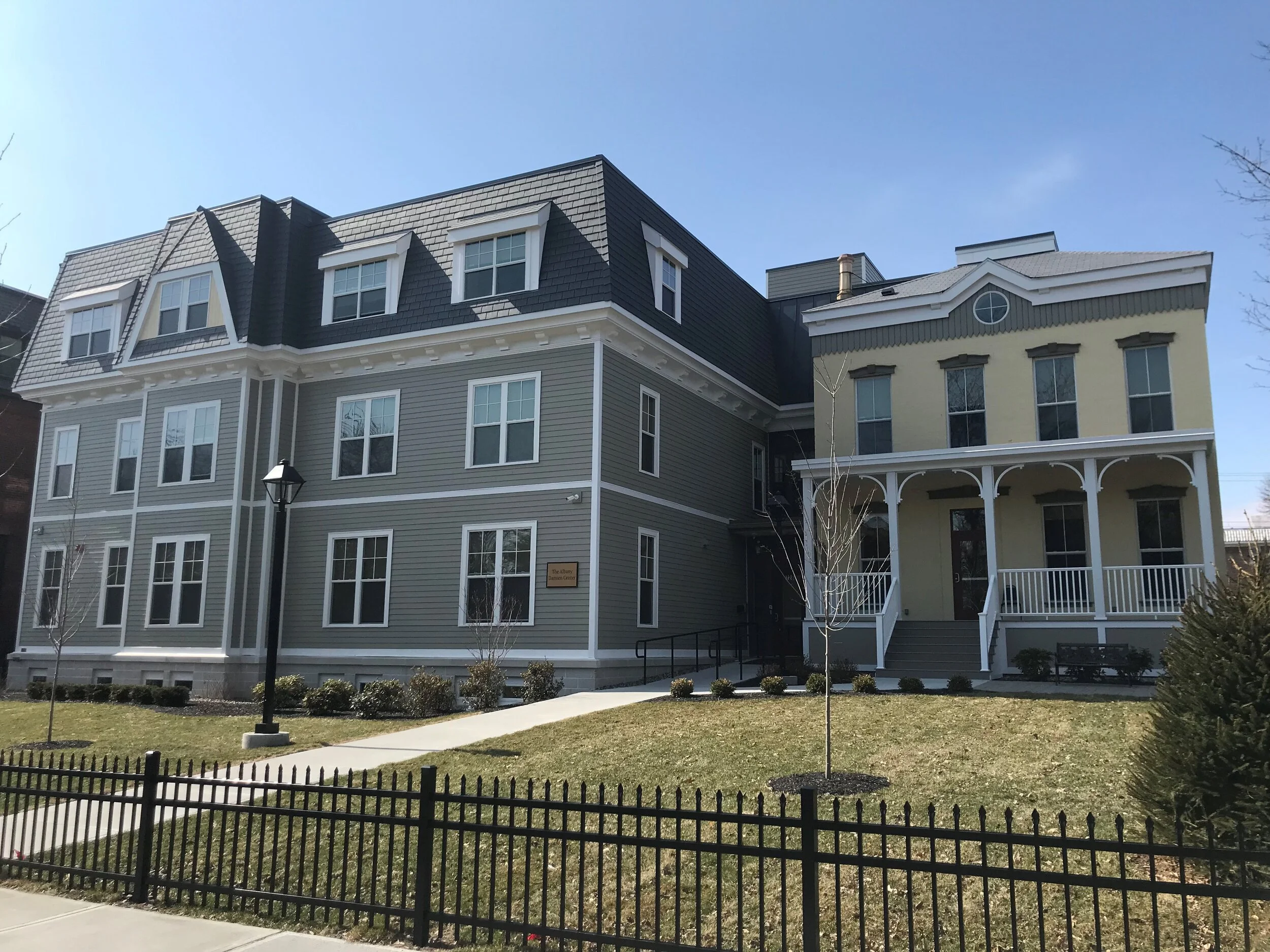 The Damien Center found its new housing in 2016: a $300,000 historic Madison Avenue property in the Pine Hills neighborhood of urban Albany. The property sat vacant for over 10 years, but after 14 months of construction, the new addition adjoined the original building to become a 26,000-square foot LEED® for Homes v4 certified Gold residence. It shelters 22 people living with HIV/AIDS in 20 permanent supportive apartments—including 18 studio and two one-bedroom apartments. The Residences also complement the neighborhood and existing historical elements—a major priority of the project.