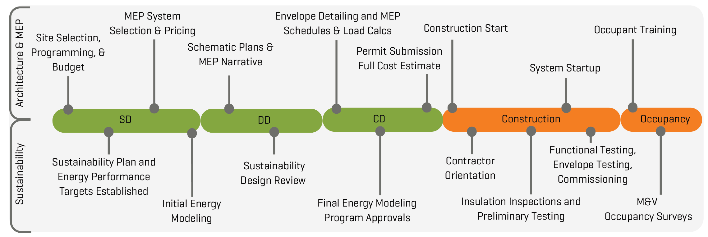 The Lafayette project underwent an integrated design process to achieve a high-performance design. The benefits of this process include fully vetted and coordinated plans including energy modeling to assess performance, fully integrated energy efficient design, early cost comparisons, and innovative features such as solar PV inclusion and demand response capabilities. The following process outlines the integrated design process: